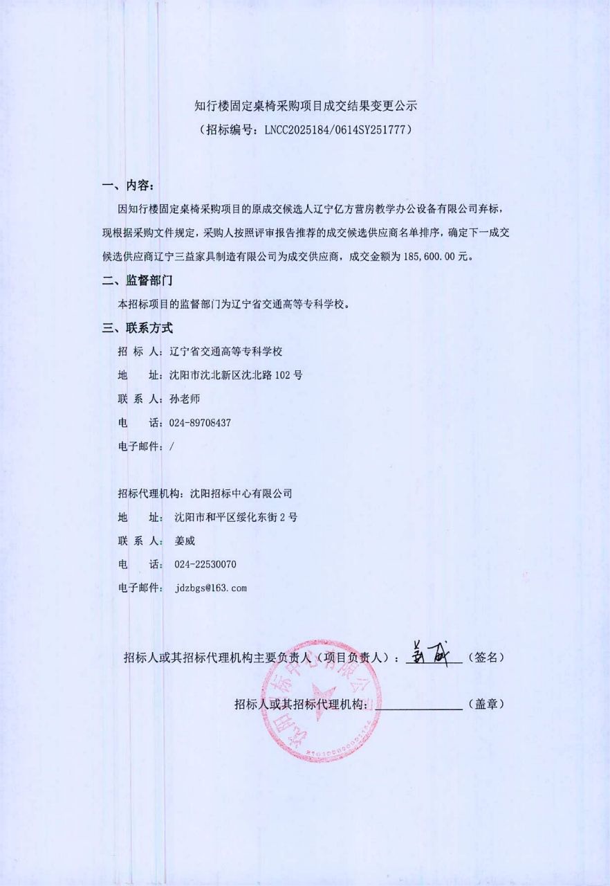 知行楼固定桌椅采购项目成交结果变更公示(LNCC2025184)