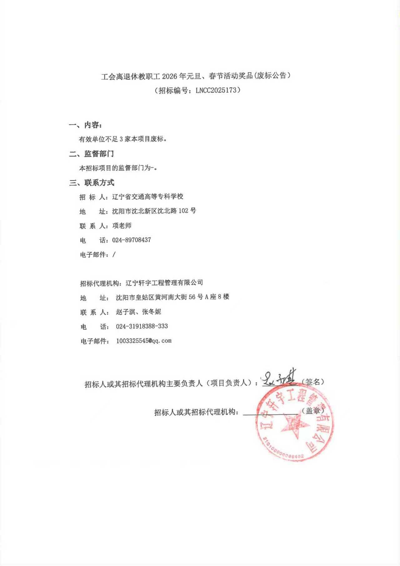 工会离退休教职工2026年元旦、春节活动奖品采购项目废标公告(LNCC2025173)