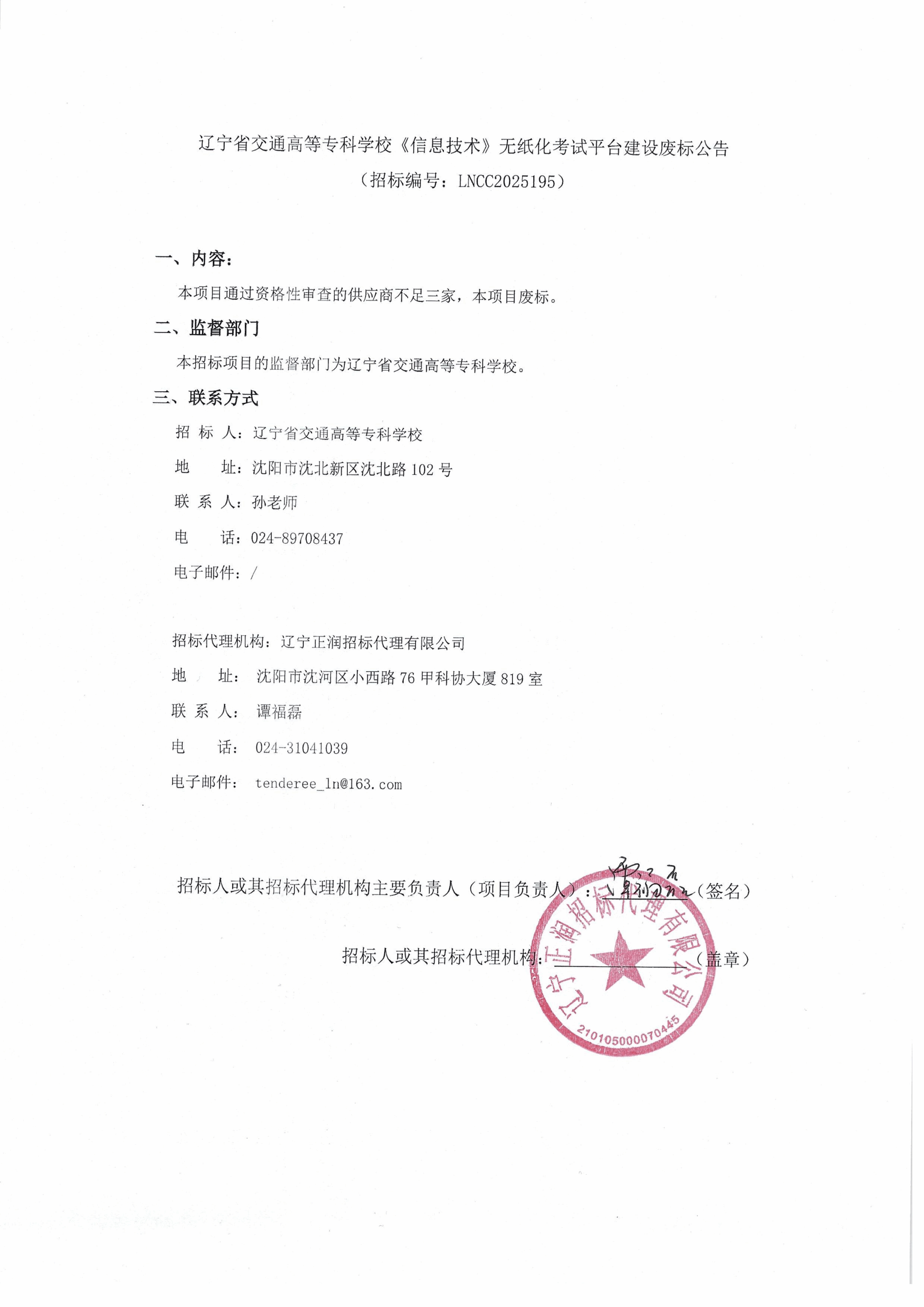 《信息技术》无纸化考试平台建设项目废标公告(LNCC2025195)