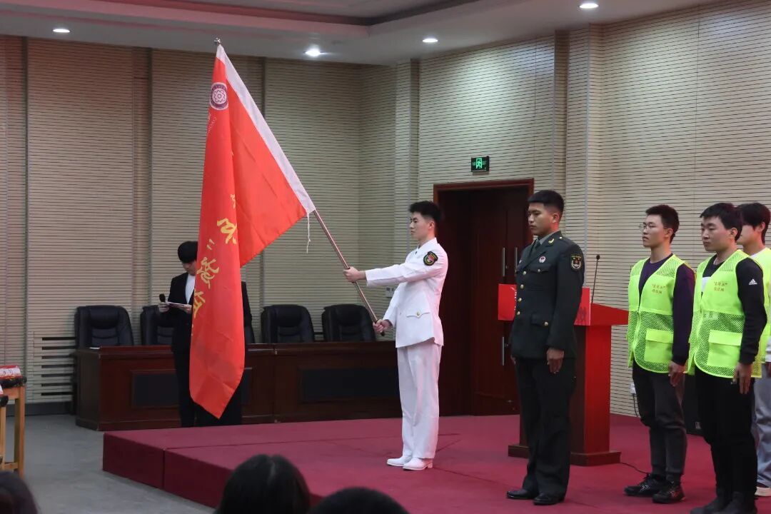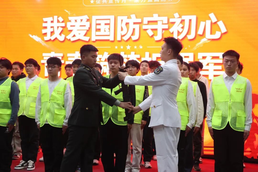 退役复学学子们身着戎装、英姿飒爽,通过队列展示、军旅故事分享等形式尽显军人本色,用亲身经历点燃全场学子的参军热情。在振奋人心的氛围中,“雷锋兵”预征班授旗授枪仪式正式举行。鲜艳的旗帜迎风招展,锃亮的钢枪熠熠生辉,预征班学员们昂首挺胸、庄严敬礼,接过的不仅是旗帜与钢枪,更是一份沉甸甸的国防责任与强军使命,彰显着青年学子矢志报国的坚定决心。